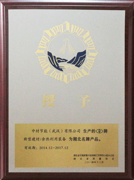 近日,經湖北省質量技術監督局、湖北省質量興省辦公室資格審查、專家委員會評價、第三方權威機構測評、現場審查等評審程序,中材節能(武漢)有限公司新型建材/余熱利用裝備系列產品,被確認為“湖北名牌”產品,授予2014年度湖北名牌產品稱號,有效期限為三年。