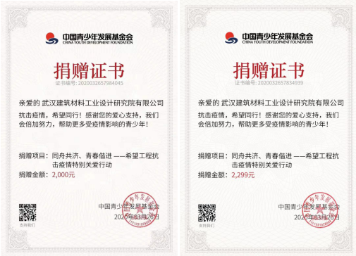 公司團委向希望工程抗擊疫情特別關愛行動 項目捐款證書